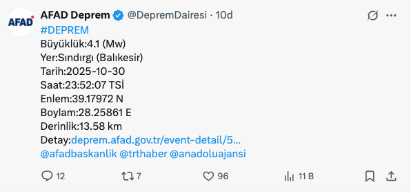 AFAD: Balıkesir'in Sındırgı İlçesinde saat 23.52'de 4.1 büyüklüğünde deprem meydana geldi