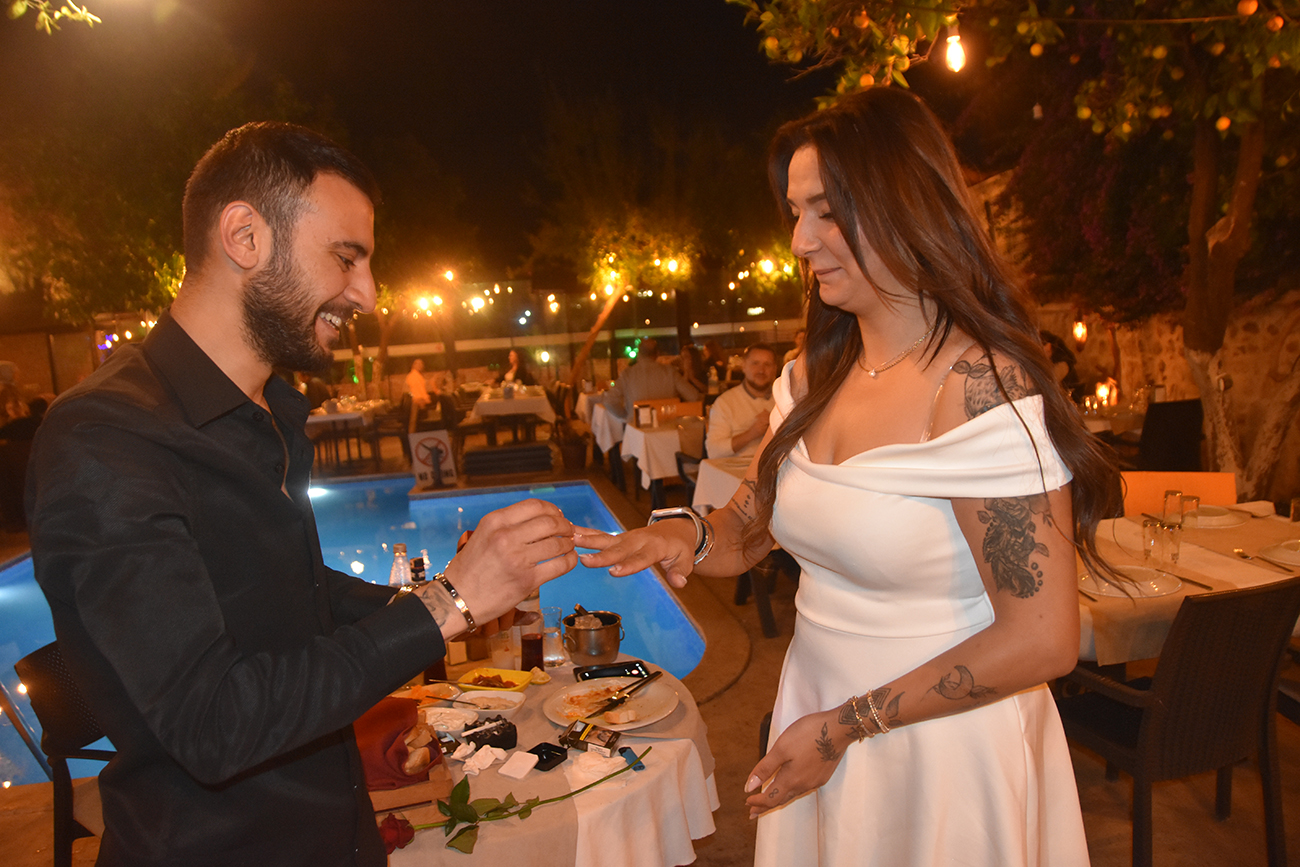 Diz Çöküp Gelen Teklif ve Alkışlar Canberk’in diz çöküp teklifi etmesi ve ardından gelen evet ile Meyhanet’te bulunan yüzlerce diğer müşterilerin alkış ve tezahüratları eşliğinde yüzüğü taktı.