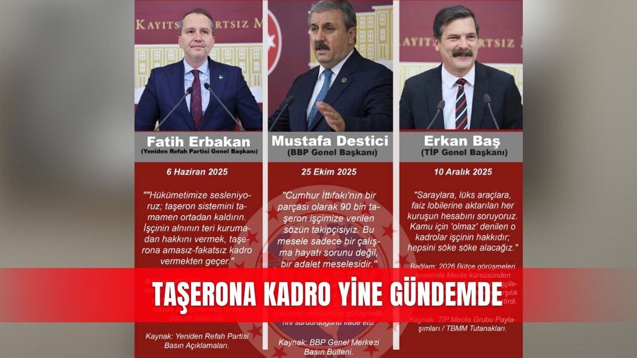 Büyük Birlik Partisi (BBP) Genel Başkanı Mustafa Destici ise konunun sadece ekonomik değil, aynı zamanda vicdani bir mesele olduğuna dikkat çekti. 25 Ekim 2025’te partisinin il başkanları toplantısında konuşan Destici, “Cumhur İttifakı’nın bir parçası olarak 90 bin taşeron işçimize verilen sözün takipçisiyiz. Bu mesele sadece bir çalışma hayatı sorunu değil, bir adalet meselesidir” dedi. Destici ayrıca, Torba Yasa süreci kapsamında hükümet yetkilileriyle görüşmelerin sürdüğünü ifade etti. Türkiye İşçi Partisi Genel Başkanı Erkan Baş da taşeron işçilerin kadro talebini Meclis kürsüsüne taşıdı. 10 Aralık 2025’te bütçe görüşmeleri sırasında konuşan Baş, “Saraylara, lüks araçlara, faiz lobilerine aktarılan her kuruşun hesabını soruyoruz. Kamu için ‘olmaz’ denilen o kadrolar işçinin hakkıdır; hepsini söke söke alacağız” sözleriyle hükümete yüklendi. Baş, taşeron işçilere kadro verilmemesini sert bir dille eleştirdi. Farklı siyasi çizgilerden gelen bu açıklamalar, taşeron işçi sorununun ortak bir gündem başlığı haline geldiğini ortaya koyarken, gözler yeniden Meclis’te atılacak adımlara çevrildi. Milyonlarca çalışan, yapılacak yasal düzenlemelerle kadro beklentisinin karşılanmasını umut ediyor.