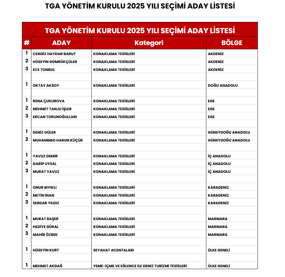 TGA seçimleri için kesinleşen aday listesine göre 12 kişinin seçileceği konaklama tesisleri sektöründe 18 aday çıktı. Akdeniz, Marmara ve Doğu Anadolu dışındaki bölgelerde yarış olacak. Akdeniz'den seçilecek 3 isim için 3 aday bulunuyor ve bu adaylar Cengiz Haydar Barut, Hüseyin Gümrükçüler ve Ece Tonbul oldu. Marmara'dan seçilecek 3 isim için Murat Başer, Hediye Güral ve Mahir Özbek aday oldu. 2 kişi seçilecek Ege'den Rena Çukurova, Mehmet Tanju İşler ve Ercan Torunoğulları yarışacak. 1 kişi seçilecek Güneydoğu Anadolu'dan Deniz Güler ve Muhammed Harun Küçük aday oldu. 2 kişi seçilecek İç Anadolu'daki 3 aday Yavuz Demir, Garip Uysal ve Murat Yavuz oldu. 2 kişi seçilecek Karadeniz'de Onur Bıyıklı, Metin İnan ve Serdar Yıldız, 1 kişinin seçileceği Doğu Anadolu'da ise tek aday Oktay Aksoy bulunuyor.