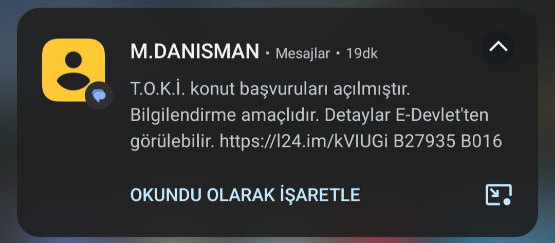 Son dönemde e-Devlet ve TOKİ adı kullanılarak gönderilen sahte SMS ve bildirimlerle vatandaşlara sosyal konut başvurularının açıldığı bilgisi veriliyor. Mesajlarda yer alan bağlantılar ya da yönlendirmeler aracılığıyla kişilerden para talep edilerek dolandırıcılık yapıldığı tespit edildi. Yetkililer bu ve benzeri mesajların resmi kurumlar tarafından gönderilmeyeceğine dikkat çekerek şu uyarıları yapıyor: "Bu tür mesajlar TOKİ veya e-Devlet tarafından resmi olarak gönderilmez. Başvurular yalnızca e-Devlet üzerinden veya yetkili bankalar aracılığıyla yapılır. Resmi kurumlar kişisel banka bilgisi, e-Devlet şifresi veya para talep etmez."