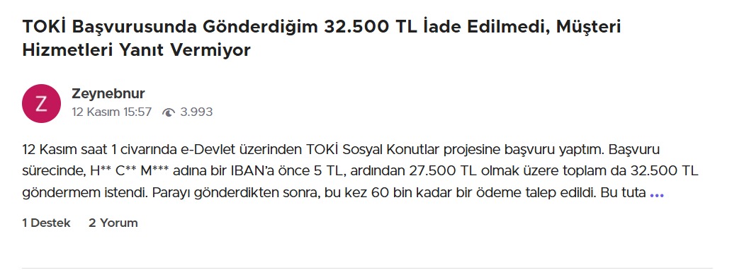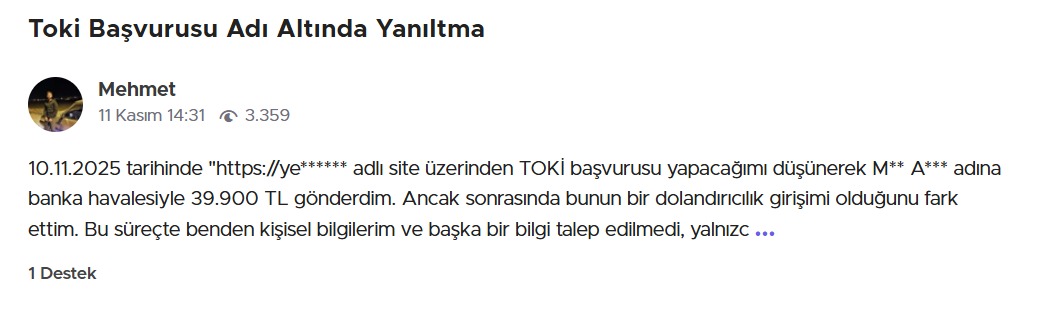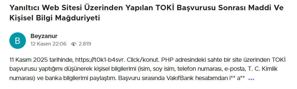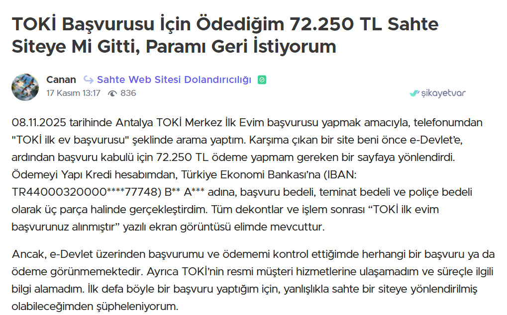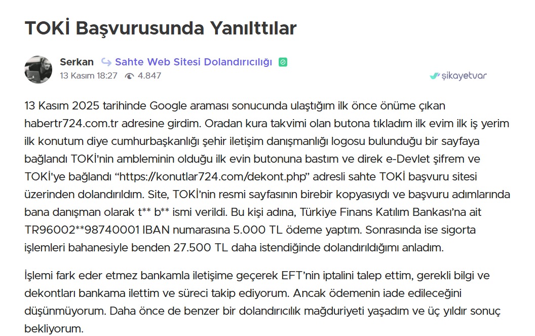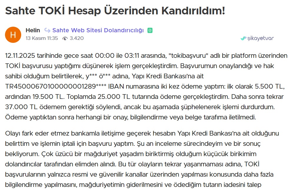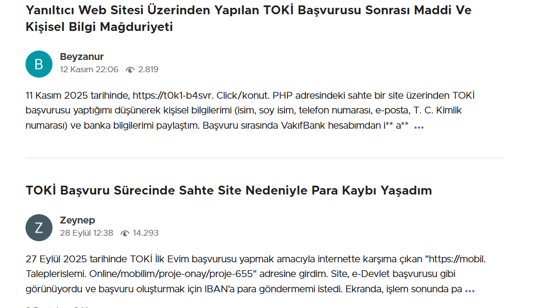 Sahte siteler nedeniyle dolandırıldığını belirten yüzlerce kişi, Şikayetvar platformuna başvurdu. Şikayetlerde ortak nokta ise sahte sitelerin gerçek TOKİ web sayfasından ayırt edilmesinin zor olması. Şikayetlerden bazıları şöyle: “TOKİ’ye başvuru yaptığımı sanarak bilgileri doldurdum, ardından farklı numaralardan sürekli aramalar gelmeye başladı. Sonradan sitenin sahte olduğunu öğrendim.” “Google’da en üstte çıkan başvuru linkine tıkladım. Benden ‘işlem ücreti’ adı altında ödeme istediler. TOKİ’nin böyle bir talebi olmadığını fark edince dolandırıldığımı anladım.” “Sitenin tasarımı, logosu, hata vermeyen formları birebir aynıydı. E-devlet yönlendirmesi bile taklit edilmiş. Ancak bilgilerim çalındıktan sonra sahte olduğunu anladım.” Vatandaşlar, bu sahte sitelerin kaldırılması ve resmi kurumların daha görünür hale getirilmesi için yetkililere çağrıda bulunuyor.