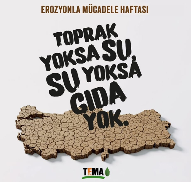 TEMA Vakfı, 17-30 Kasım Erozyonla Mücadele Haftası kapsamında ‘Toprak Yoksa Su, Su Yoksa Gıda Yok’ söylemiyle toprağın su, gıda ve iklimle arasındaki kopmaz bağa dikkat çekiyor. Dünya genelinde her saniye 1260 ton, yani yaklaşık 42 kamyon dolusu verimli toprağın erozyon nedeniyle yok olduğunu belirten TEMA Vakfı, bu kaybın yalnızca doğanın değil, yaşamın da kaybı anlamına geldiğini ifade etti. Erozyonla Mücadele Haftası kapsamında yapılan açıklamada, toprağın korunmasının geleceğin su ve gıda güvenliği için kritik öneme sahip olduğuna dikkat çekildi.