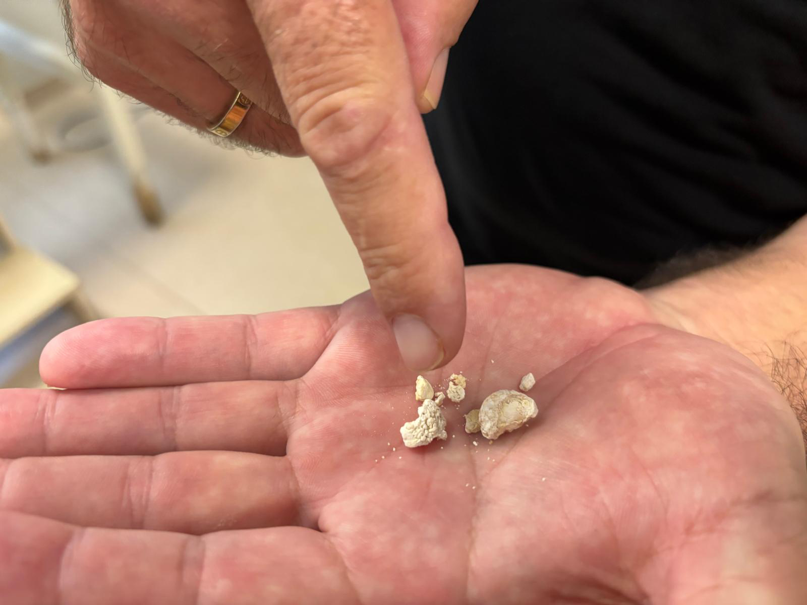 Tükürük bezinden çıkan taşları kutuda saklayan Metin Paçacı yaşadıklarını anlatarak, "Bu taşları saklayacağım çünkü bunlar bana çok eziyet verdi, çok yıprattı ama şu an çok şükür iyiyim. İlk zamanlar ağzıma minik taşlar geldiğinde bunların diş taşı olduğunu düşündüm. Geçen şubat ayında işim gereği şehir dışındaydım. Bulunduğum yer çok soğuktu. Boynumda şişme olunca doktora gittim. Soğuk algınlığı ve bademcik denilerek antibiyotik verildi. Antibiyotikle sorun giderilmişti" dedi.