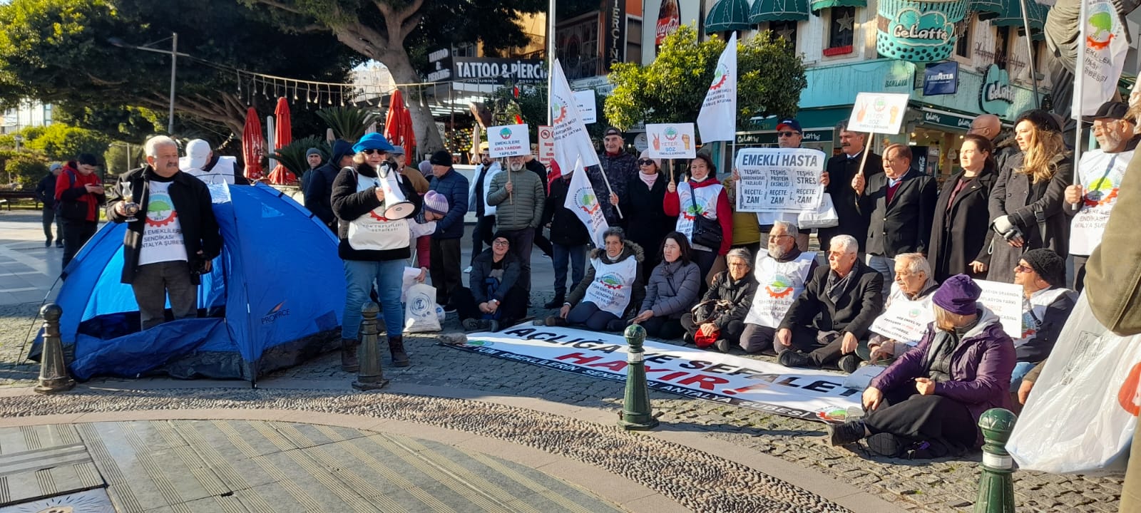 Tüm Emekliler Sendikası Antalya Şubesi, emeklilerin yaşadığı ekonomik sorunlara dikkat çekmek amacıyla Attalos Meydanı’nda basın açıklaması yaparak oturma eylemi düzenledi. Basın açıklamasını Tüm Emekliler Sendikası Antalya Şubesi adına Ferzan Sarsılmaz okudu. Açıklamada, emeklilerin uzun süredir sürdürdüğü hak mücadelesinin çeşitli yöntemlerle etkisizleştirilmeye çalışıldığına dikkat çekilerek, “Aylar boyunca sürdürdüğümüz meşru ve haklı mücadeleyi manevralarla azaltabileceklerini düşünenler bir kez daha yanılmıştır. Emeklilerin iradesi bastırılamaz, mücadelesi ertelenemez” denildi.