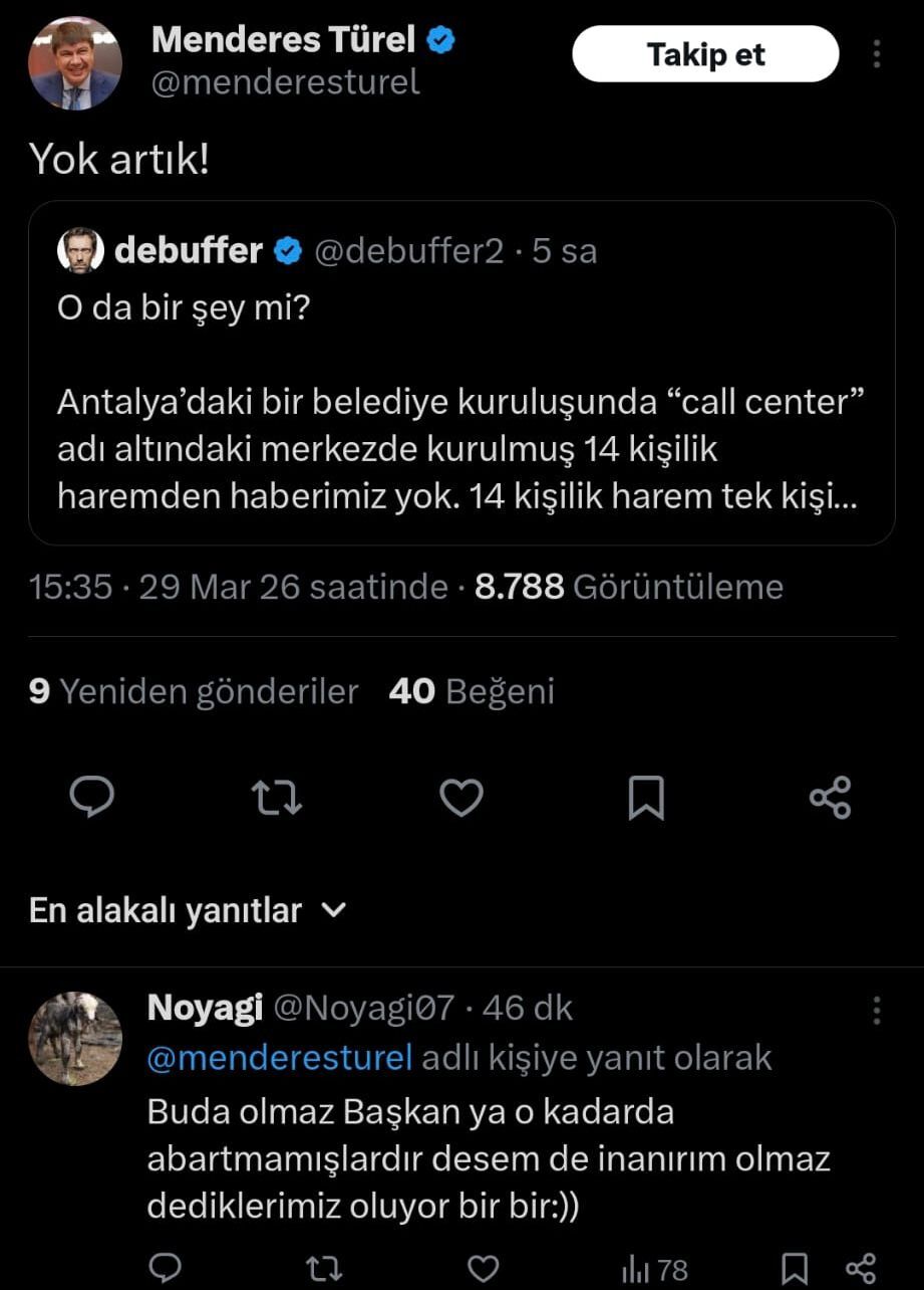 Öte yandan Türel, belediyede kurulduğu iddia edilen bir “call center” ile ilgili paylaşıma ise “yok artık” diyerek tepki verdi. Söz konusu paylaşımda, “call center” adı altında kurulan merkezde 14 kişinin çalıştığı, ancak merkeze telefon hattı dahi çekilmediği iddia edildi. Paylaşımda şu ifadeler yer aldı: “O da bir şey mi? Antalya’daki bir belediye kuruluşunda “call center” adı altındaki merkezde kurulmuş 14 kişilik haremden haberimiz yok. 14 kişilik harem tek kişiye hizmet ediyor ama küçük bir unutkanlık olmuş. “Call Center”a telefon hattı çekilmemiş… Eskiden bir belediye başkanı en fazla bir yakınını işe alırdı. Şimdi öyle mi?"