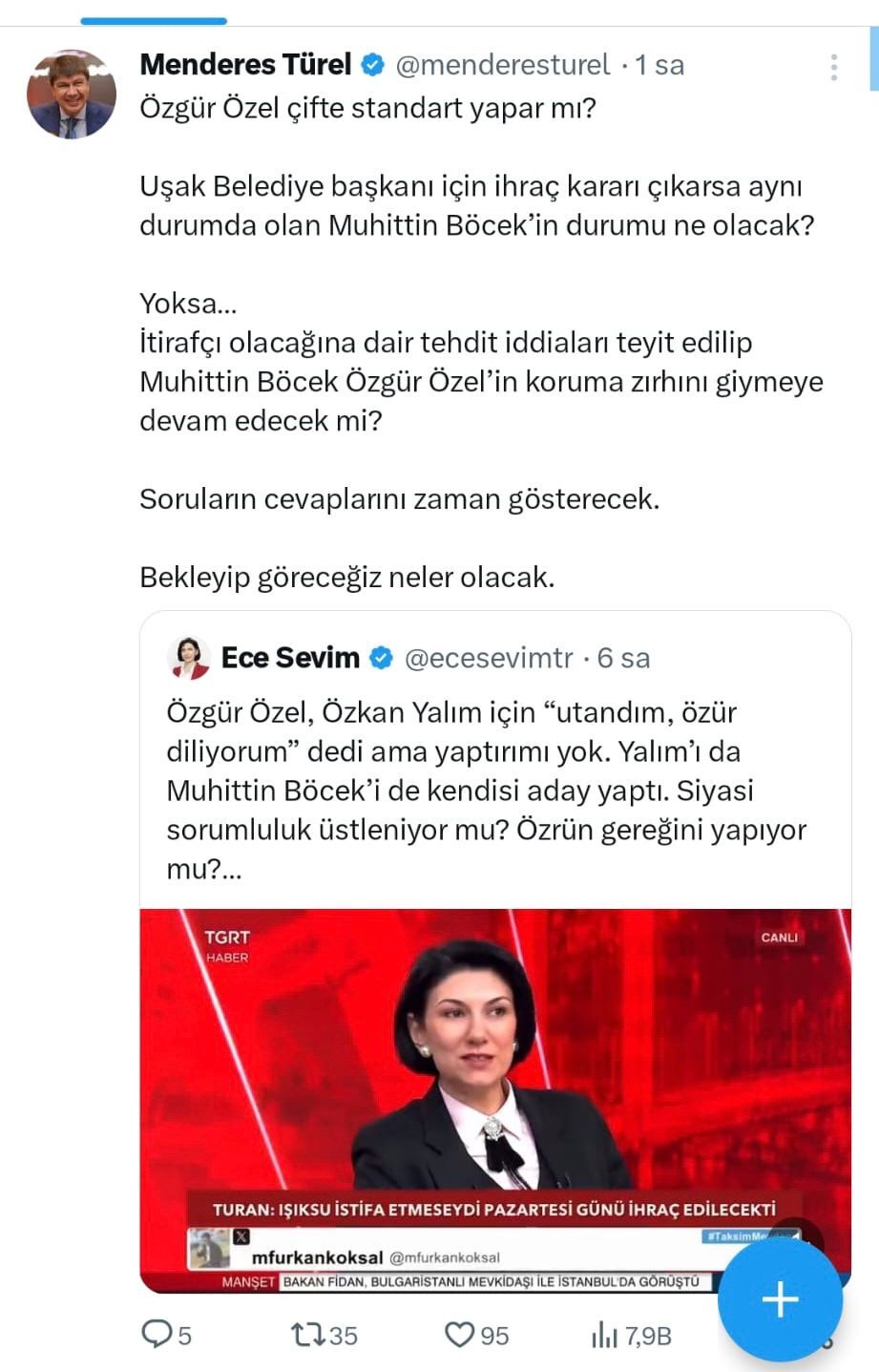 “Özgür Özel çifte standart yapar mı? Uşak Belediye Başkanı için ihraç kararı çıkarsa aynı durumda olan Muhittin Böcek’in durumu ne olacak? Yoksa… İtirafçı olacağına dair tehdit iddiaları teyit edilip Muhittin Böcek Özgür Özel’in koruma zırhını giymeye devam edecek mi? Soruların cevaplarını zaman gösterecek. Bekleyip göreceğiz neler olacak.”