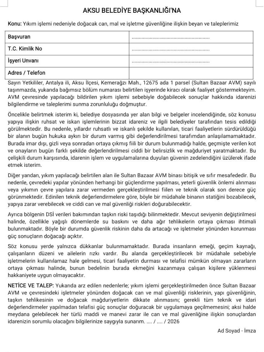 Esnaflar tarafından ilgili makamlara sunulan dilekçede ise işin teknik ve hukuki boyutu gözler önüne serildi. Dilekçede öne çıkan kritik uyarılar var. Yıkım yapılacak alanın AVM binasıyla bitişik olması nedeniyle, yapılacak bir müdahalenin ana binanın statiğini bozabileceği ve çökme riski yaratabileceği belirtiliyor. Bölgenin DSİ verilerine göre taşkın riski taşıdığı, kot seviyesinin değiştirilmesi durumunda yağışlı havalarda dükkanları su basabileceği uyarısı yapıldı. Yıllar önce ruhsat veren idarenin, bugün aynı yapıyı ‘hukuka aykırı’ görmesinin hukuki güvenliği zedelediği ifade edildi.