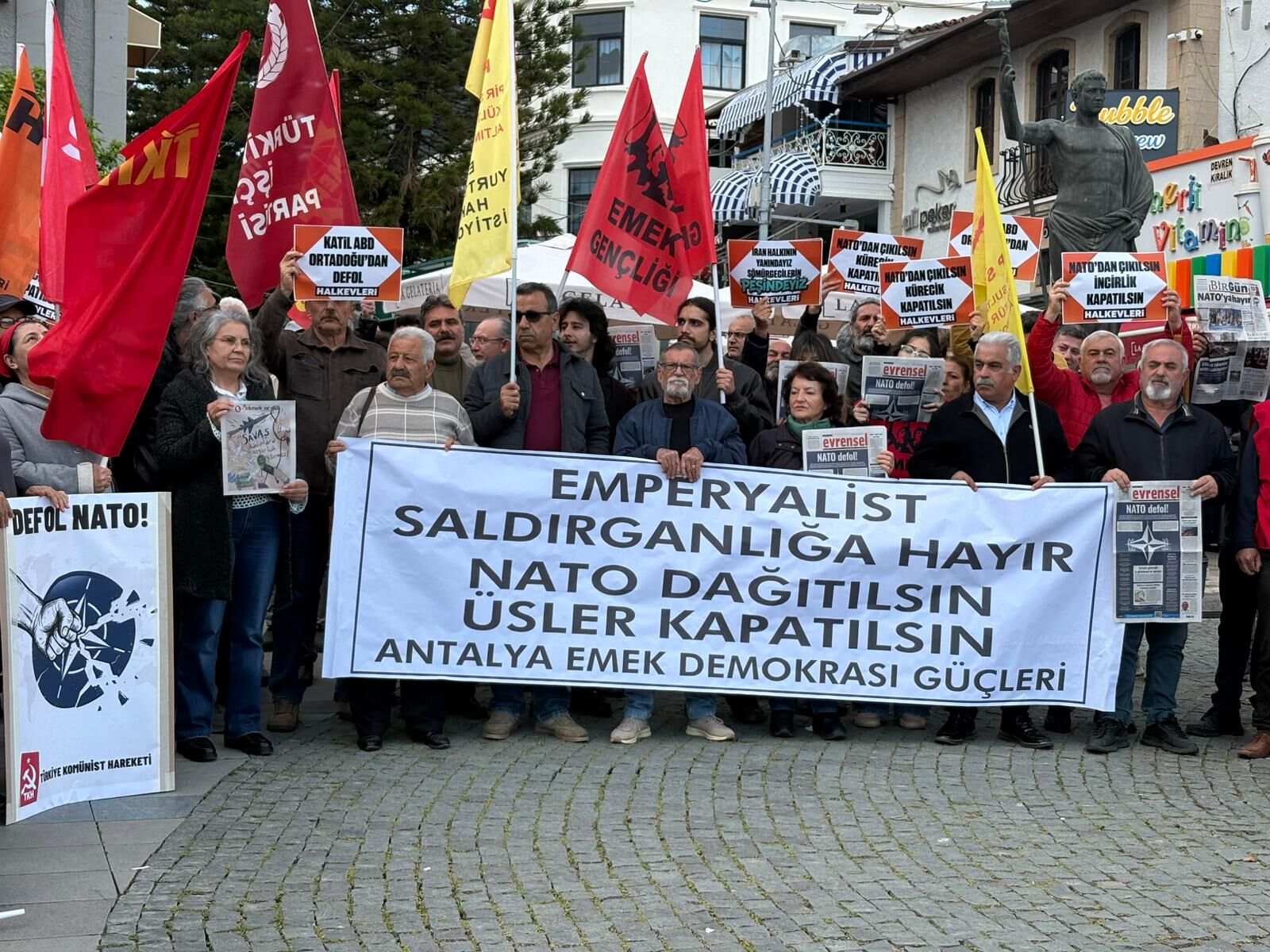 Antalya Emek ve Demokrasi Güçleri, bölgede yükselen gerilim ve İran’a yönelik emperyalist saldırılara ilişkin Attalos’ta basın açıklaması düzenledi. Platform adına açıklamada bulunan Antalya Halkevi Başkanı Gülcan Şahin, 28 Şubat’ta başlayan müdahalenin bölge halklarını yıkıma sürüklediğini vurgularken, Türkiye’nin izlediği dış politika ve NATO ile olan ilişkileri hedef aldı. Gülcan Şahin, İran’a yönelik saldırıların ‘özgürlük’ vaadiyle maskelenen bir sömürgeleştirme faaliyeti olduğunu ifade etti. Saldırıların sivilleri, kadınları ve çocukları hedef aldığını belirten Şahin, "Bu savaşın amacı İran’ın yeniden sömürgeleştirilmesi, İsrail’in güvenliğinin sağlanması ve ABD’nin sarsılan hegemonyasının yeniden inşa edilmesinden başka bir şey değildir" dedi.