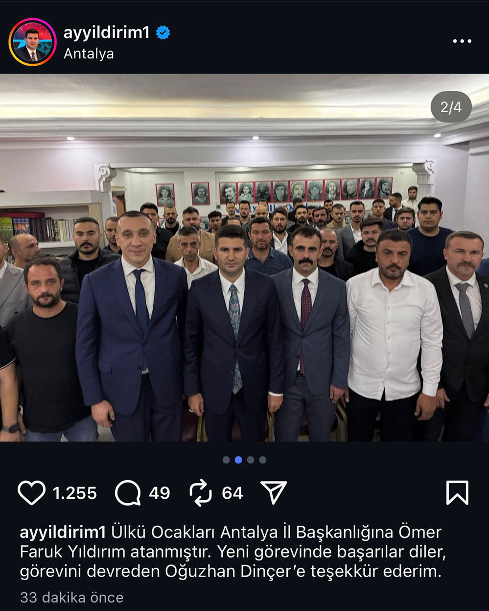 Genel Başkan Yıldırım paylaşımında, “Ülkü Ocakları Antalya İl Başkanlığına Ömer Faruk Yıldırım atanmıştır. Yeni görevinde başarılar diler, görevini devreden Oğuzhan Dinçer’e teşekkür ederim” ifadelerine yer verdi. Görevi devralan Ömer Faruk Yıldırım’ın önümüzdeki günlerde Antalya genelindeki teşkilat yapılanmasını şekillendirmesi bekleniyor.