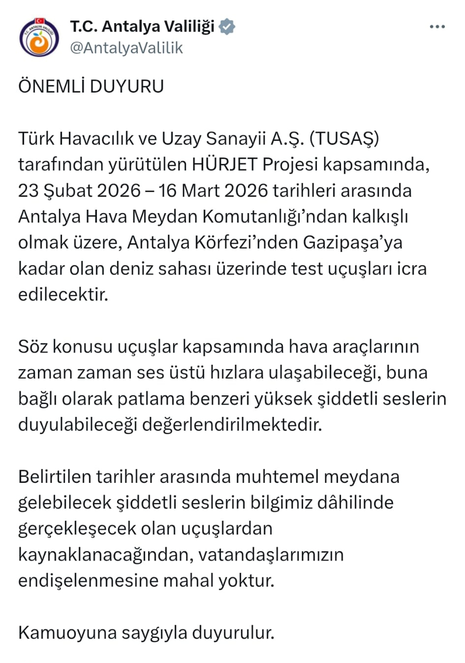 Antalya Valiliği'nden yapılan açıklamaya göre, HÜRJET Projesi kapsamında, 23 Şubat ile 16 Mart 2026 tarihleri arasında Antalya Hava Meydan Komutanlığı'ndan kalkışlı test uçuşları, Antalya Körfezi’nden Gazipaşa’ya kadar olan deniz sahası üzerinde icra edilecek.