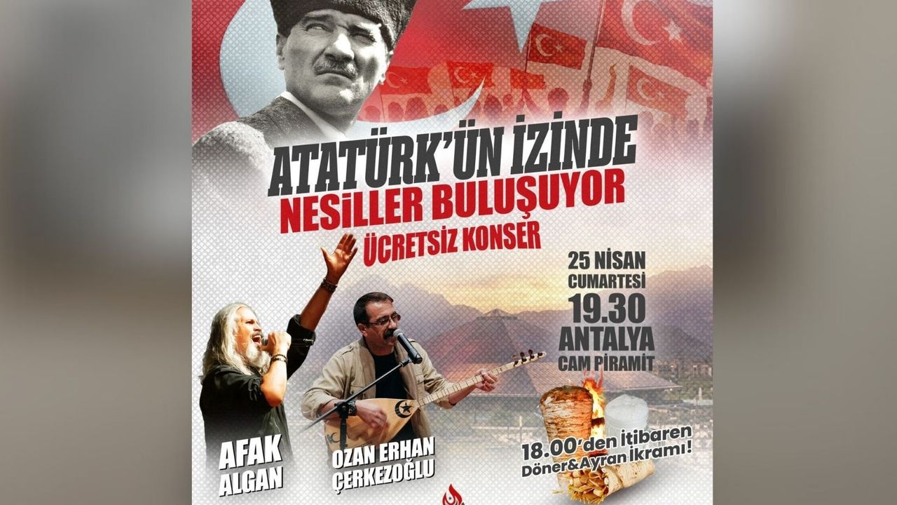 Zafer Partisi’nin organizasyonuyla gerçekleştirilecek konser, “Atatürk’ün izinde nesiller buluşuyor” sloganıyla düzenlenecek. Etkinlik, 25 Nisan Cumartesi günü saat 19.30’da Antalya Cam Piramit’te yapılacak. Özellikle 23 Nisan haftasının anlam ve önemine vurgu yapılması hedeflenen konserin, farklı yaş gruplarını bir araya getirmesi amaçlanıyor. Zafer Partisi Genel Başkan Yardımcısı Musa Ertugan, etkinliğe ilişkin yaptığı açıklamada, 23 Nisan ruhunun birlik ve beraberlik içinde yaşatılması gerektiğini belirtti. Ertugan, Antalya halkını bu anlamlı etkinlikte bir araya gelmeye davet ederek, konserin sadece bir müzik organizasyonu değil, aynı zamanda milli birlik ve dayanışma mesajı taşıdığını ifade etti.
